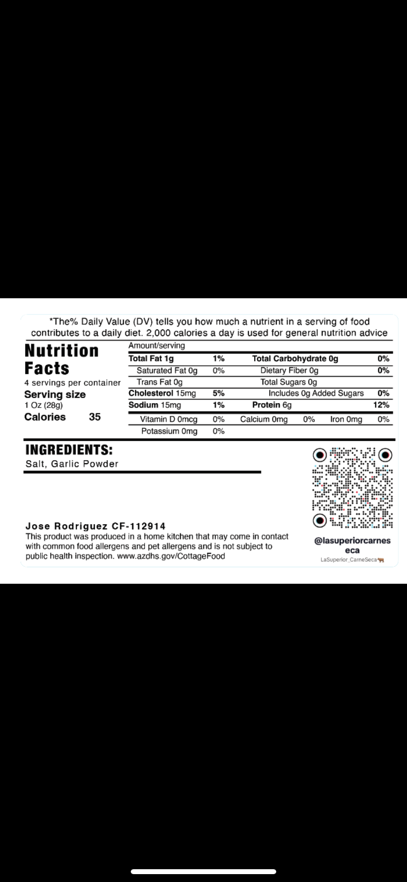 Enjoy beef protein in every bite. This dried meat is perfect for a healthy snack. With just 1 gram of fat per serving, it's a choice that values your health. Thank yourself later!