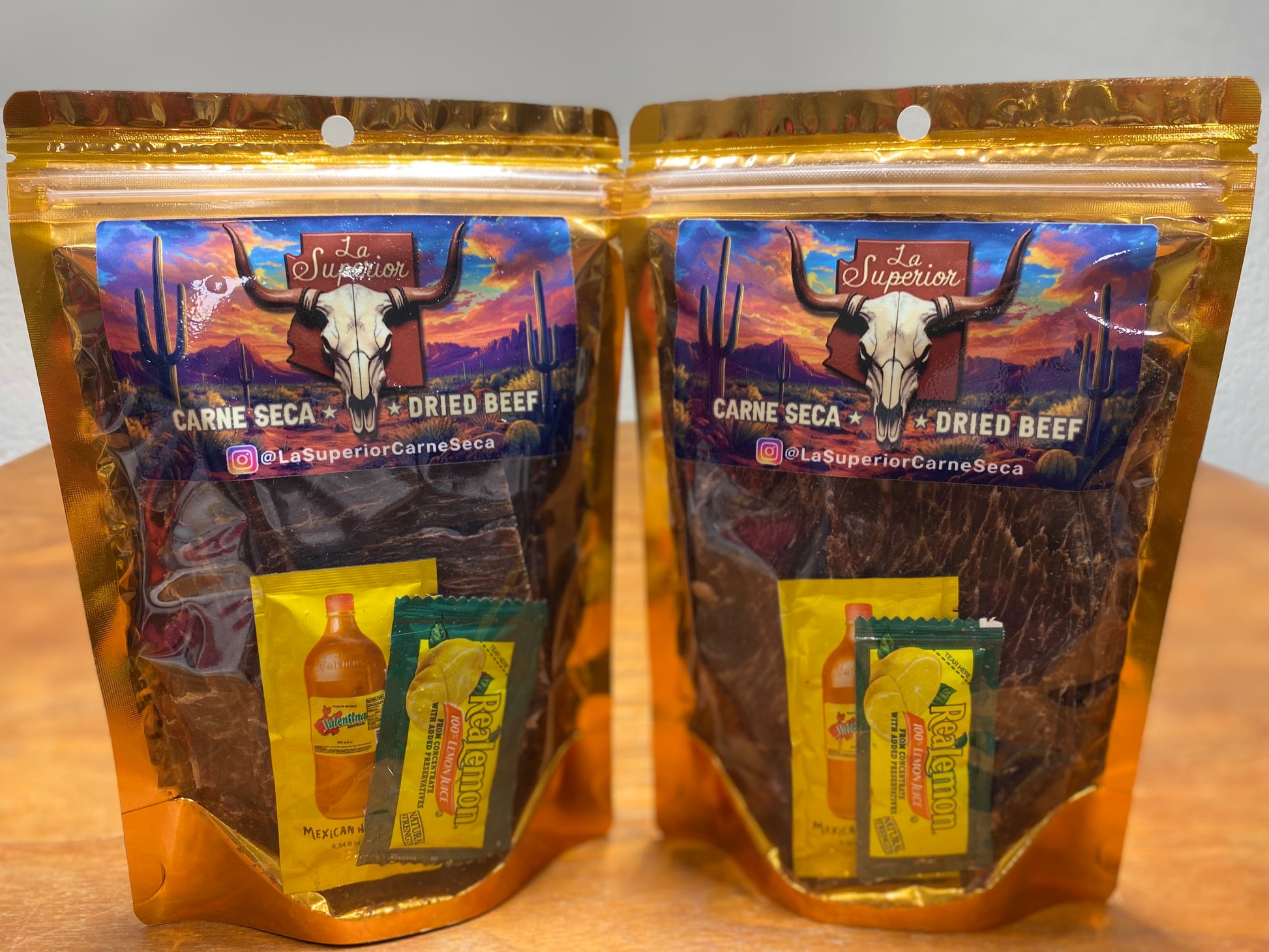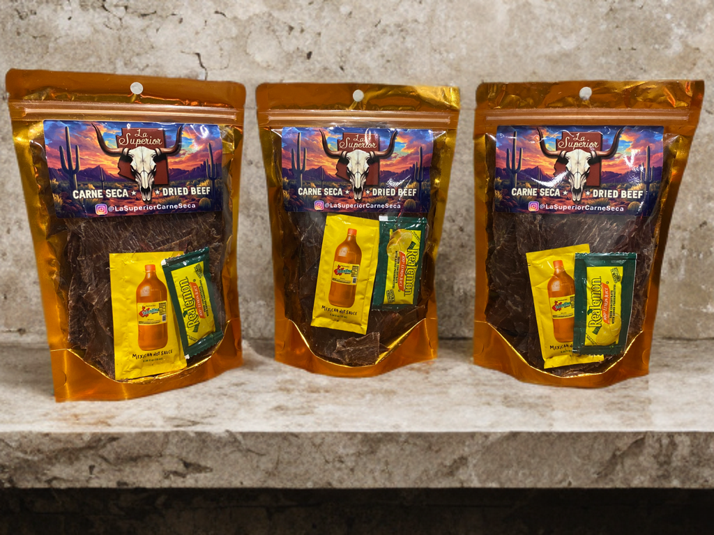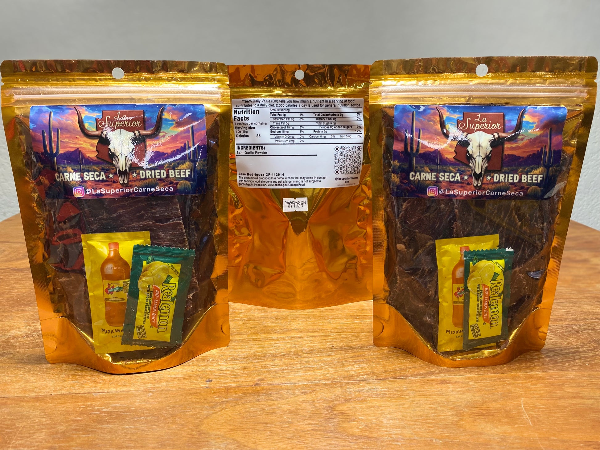 Dive into the La Superior Carne Seca, crafted from 100% pure beef. Each bite delivers a unique taste. The shiny Gold packaging sets it apart. Comes with (1)Real Lemon pack and (1)Valentina Salsa pack. Ideal for those craving a tasty, nutritious snack. Comes with 4 servings per bag. Don't miss out—buy now!